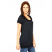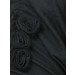 Black round neck top made of a polyester and viscose blend fabric, has a frilly neckline with frilled short sleeves and a band of three roses of the same colour just below the neck on the left, coupled with an elasticated hemline