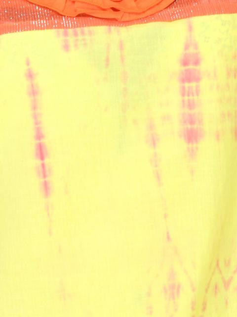Yellow and orange sleeveless V-neck top made of 100% cotton, has printed frills along the neckline, panel stitch on the chest, printed dye work and an elasticated hem
