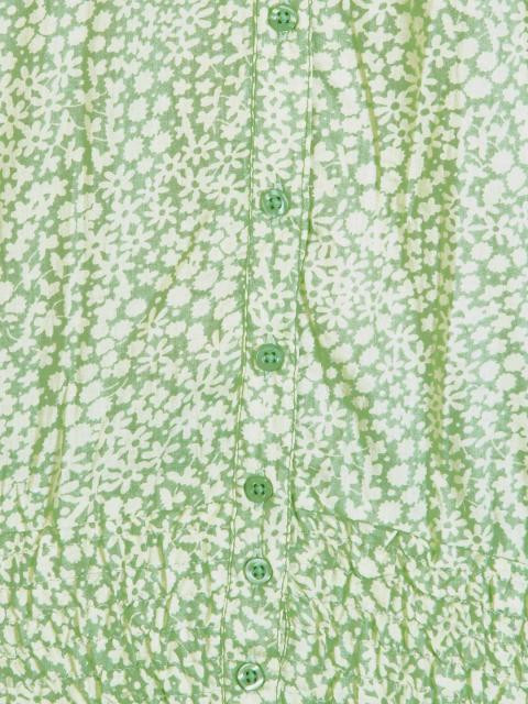 Green top with an elasticated round neckline with stitched detailing, puffed sleeves, full placket and elastic above the hem