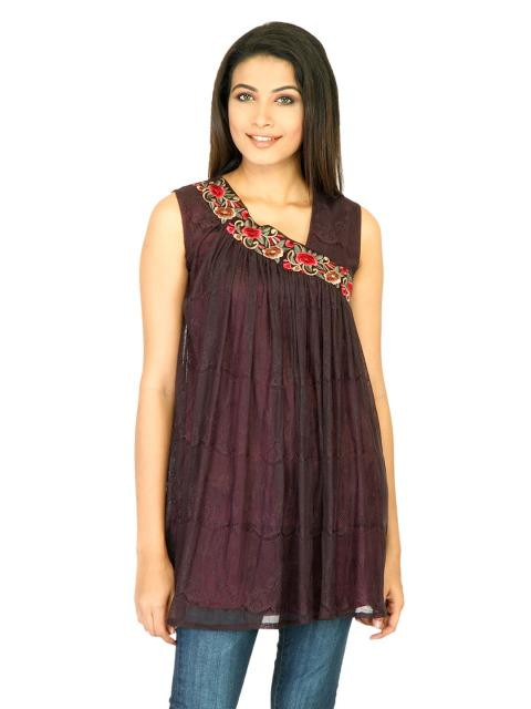 Take feminine dressing to the next level with this purple pleated tunic top from scullers. The lace upper, coupled with the contrasting delicate embroidery on the chest will make you feel amazingly pretty and confident. Team this top with leggings and heels for the perfect look.