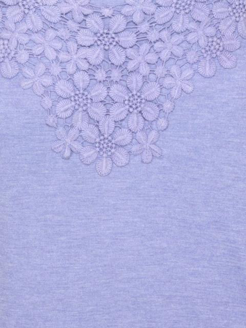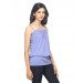 Blue top made of knitted polyester blended fabric, has adjustable shoulder straps, floral lace on the front and top gathered to a broad panel at hem