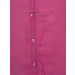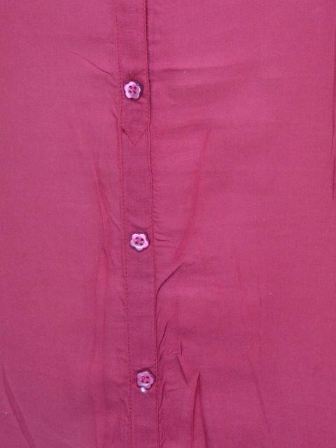 Magenta top made of woven 100% rayon, has a round neck with elasticated portions at shoulders, full buttoned placket, short puff sleeves and an elasticated hem