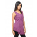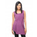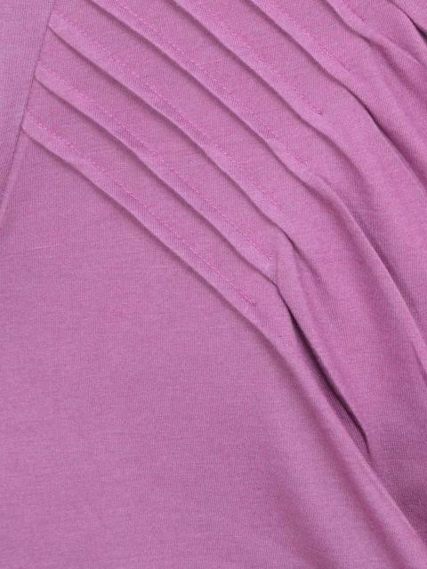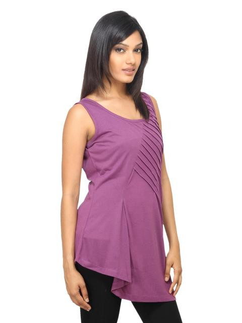 Purple sleeveless top made of a knitted polyester blend fabric, has a round neck, diagonal flaring pin-tucks from the left shoulder and an assymetrical flared hemline
