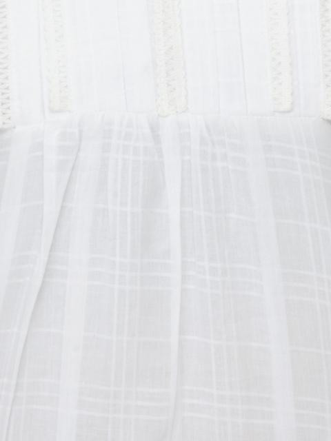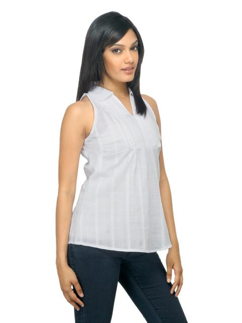 White top made of sheer, woven 100% cotton, sleeveless, has a curved spread collar with slit and has pin-tucks and lace detailing on the front with light gathers below