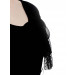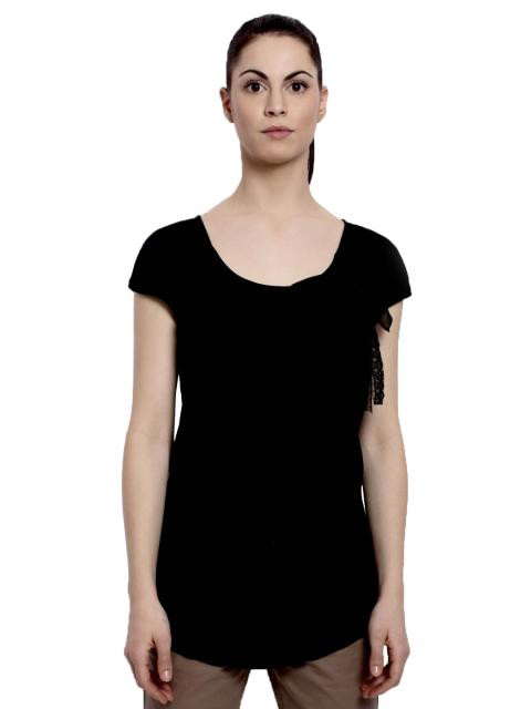 Black short sleeve top made of 100% viscose, with a 100% polyester decoration on the left chest with lace and satin ribbon, round neck and a curved hem