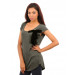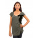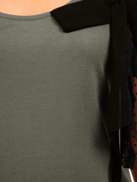 Grey short sleeve top made of 100% viscose, has a round neckline, pleated detailing on the shoulders and a lace bow on the upper left near the collar
