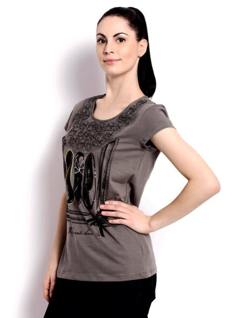 Perfect on style and great in comfort, this grey top from united colors of benetton makes for a great casual wear. The ribbon flowers appliqued on the net panel together with the corset print on the front lends this tee an edgy feel, while the fabric keeps you fresh and comfortable all day. Team it with slim Fit jeans and black heels and ooze style.