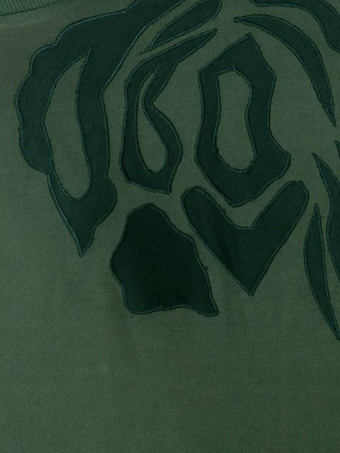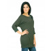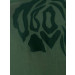 Olive green round neck top made of 100% cotton, has raglan three quarter sleeves, flock print on the left chest and sleeve and ribbed neckline and hem