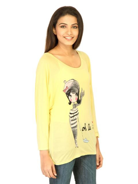 Fun and stylish, this sunny yellow T-shirt from united colors of benetton is perfect for casual wear. The dolman sleeves and illustration graphic of the little sailor girl adds to the cute factor of this tee, while the viscose fabric drapes well and accentuates your curves. Team this with white shorts and boat shoes for a great poolside look.
