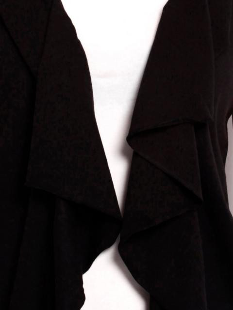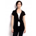 Black open placket top made of 100% cotton, has short sleeves and ruffles along the placket and hem