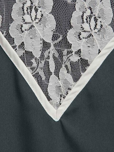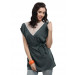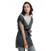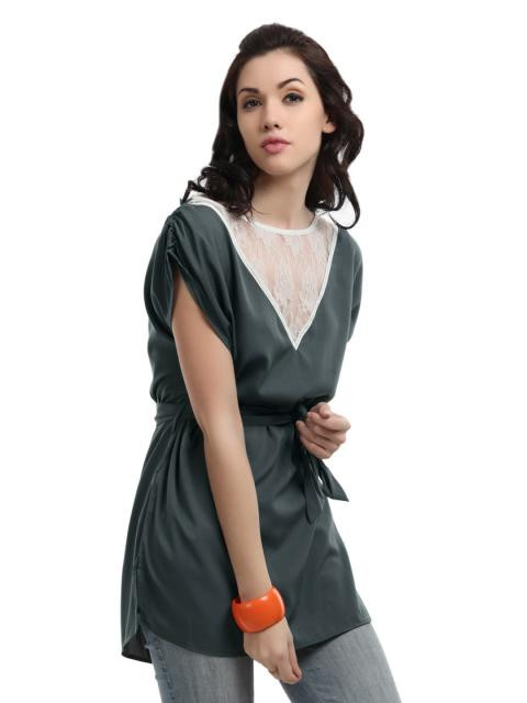 Grey top with a boat neck, V shaped white lace on the front with taping, short extended sleeves which are elasticated on the shoulders, sash with two loops on the sides for a snug fit, curved hem with slit sides