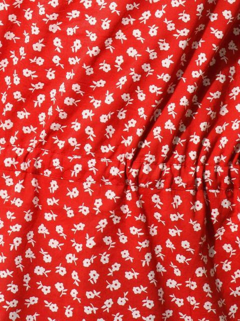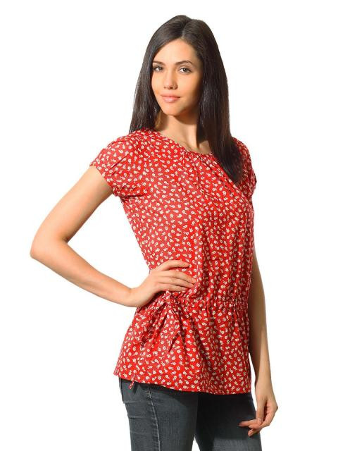 Red floral print T-shirt,with a round-neck, short sleeves gathered on the shoulders and cuffs with a key hole and button detail on the cuff, has pin-tucks below the neckline and tie-up detail at the waist