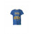 Dark navy blue T-shirt made of 100% cotton, has a ribbed round neckline with tape detailing on the inseam, short sleeves, distressed look print on the front, appliqued brand seal with distressed look lettering on the back right hemline and brand tab attached to the left hem on the front