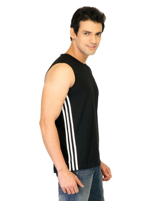 Look cool while working out in this black sleeveless vest from adidas. The iconic three stripes on the sides and the embroidered logo on the upper left chest increases the brand appeal, while the fabric keeps you feeling fresh and comfortable all day long. Team it with tracks and performance shoes for sporting activites.