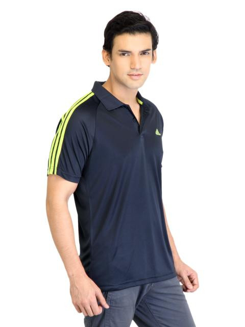 The iconic green stripes do all the talking on this navy blue polo neck T-shirt from adidas. The embroidered brand name on the upper left chest adds interesting detail, while the polyester fabric keeps you feeling comfortable on extended training sessions. Team this with tracks or training shorts.