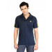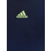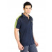Navy blue polo neck T-shirt made of 100% polyester, has a ribbed collar, raglan sleeves with iconic stripes in fluorescent green from collar to cuffs, buttoned chest placket and embroidered brand name on the upper left chest