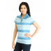 Blue striped polo neck T-shirt made of 95% cotton and 5% lycra, has a ribbed collar, short sleeves, buttoned chest placket and embroidered brand name on the left hem