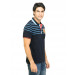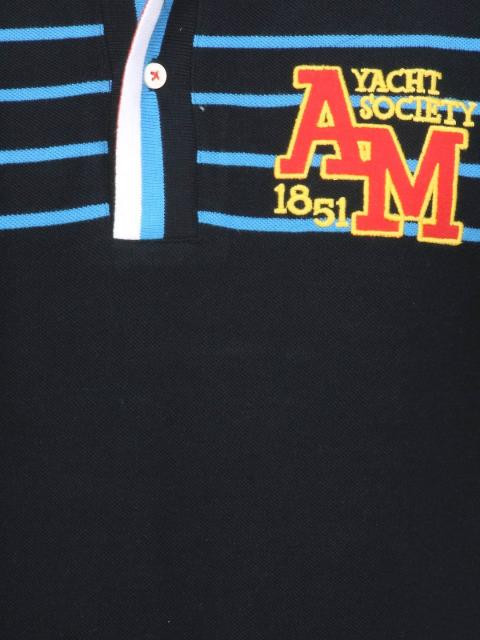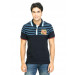 Navy blue polo T-shirt made of 100% compact cotton, has a ribbed collar with blue and white tipping, buttoned chest placket with blue and white tipping, short sleeves with a red stripe on the ribbed hems, blue stripes on the chest and sleeves, appliqued club branding on the left chest and has a vented hem