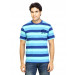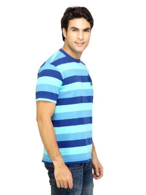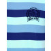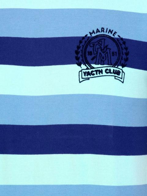 Blue round neck T-shirt with blue and turquoise stripes, made of 100% compact cotton, has a ribbed collar, short sleeves, branding on the left sleeve and club branding in flock print on the left chest
