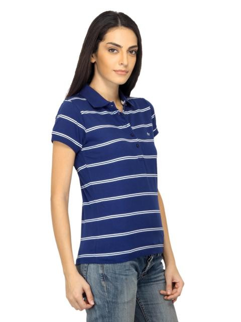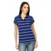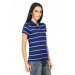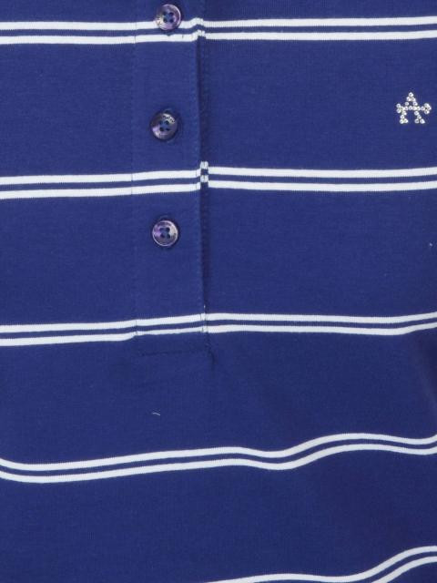 Blue and white striped polo neck T-shirt made of 95% viscose and 5% lycra, has short sleeves with ribbed cuffs, chest placket and crystal embellishment on the left chest