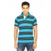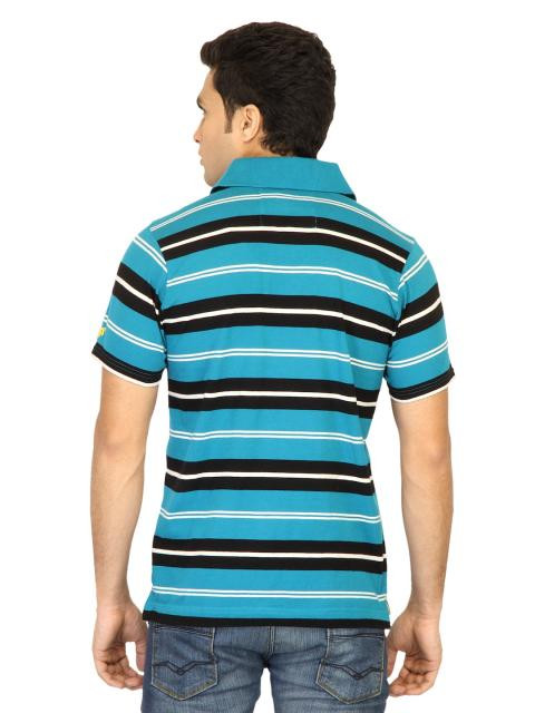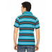 Teal blue polo T-shirt made of 100% cotton, has blue and white stripes, two-button placket, short sleeves with brand name printed on the left sleeve, fabric tape detailing on the inseam of the collar, number '029' printed on the inside of the collar at the back, and a vented hem