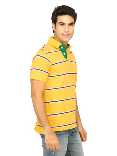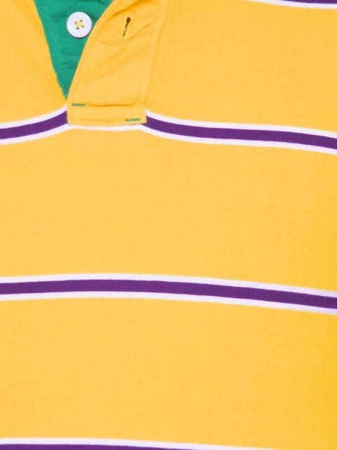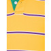 Yellow polo T-shirt with purple and white stripes, made of 100% cotton, has a ribbed neck with a buttoned chest placket, short sleeves with branding in flock print on the left sleeve, and a vented hem with twill tape detailing on the inseam of the collar and the vents