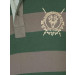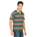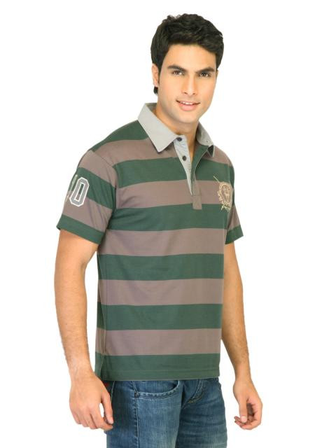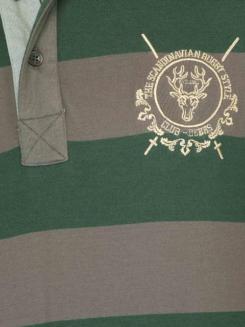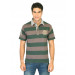 Bottle green and brownish grey broad striped polo T-shirt made of 100% cotton, has a buttoned chest placket, felt tape detailing on the inseam of the neckline, short sleeves, brand detail embroidered on the left chest, and a vented hem