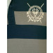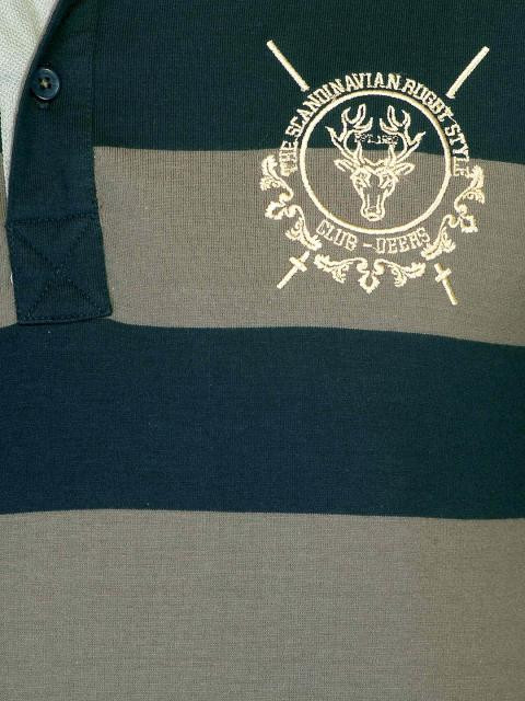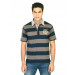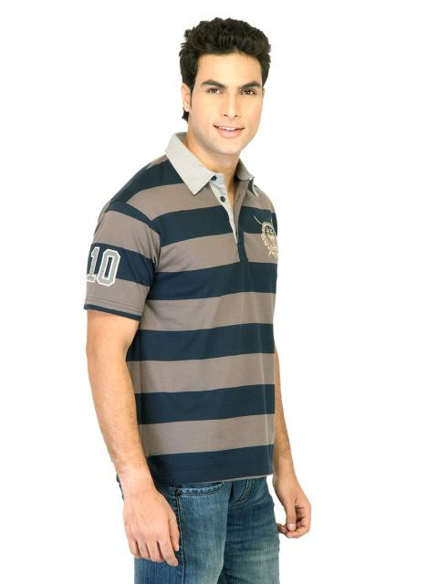 Navy blue and brownish grey broad striped polo T-shirt, made of 100% cotton, has a buttoned chest placket, felt tape detailing on the inseam of the neckline, short sleeves, brand detail embroidered on the left chest, and a vented hem