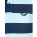 Navy blue and light blue broad striped polo T-shirt made of 100% cotton, has a buttoned chest placket, felt tape detailing on the inseam of the neckline, short sleeves, brand detail embroidered on the left chest, and a vented hem