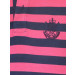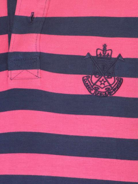 Navy blue and pink broad striped polo T-shirt made of 100% cotton, has a buttoned chest placket, felt tape detailing on the inseam of the neckline, short sleeves, brand detail embroidered on the left chest, and a vented hem