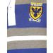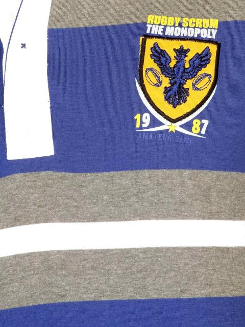 Blue, grey and white striped polo T-shirt made of 100% cotton, has a buttoned chest placket, short sleeves, brand detail appliqué d on the left chest, and a vented hem