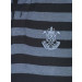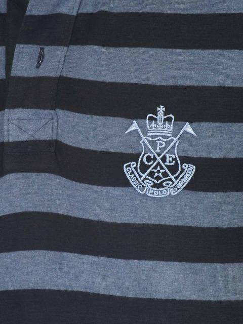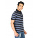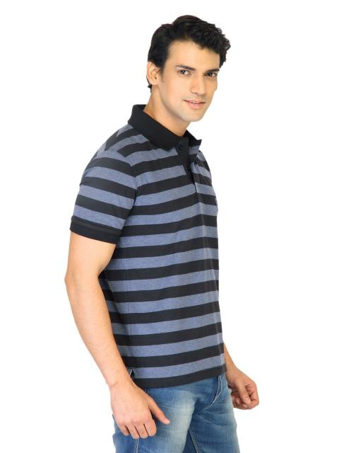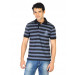 Black and blue striped polo T-shirt made of 100% cotton, has short sleeves with ribbed hems, ribbed collar with a buttoned chest placket, embroidered brand logo on left chest and a vented hem