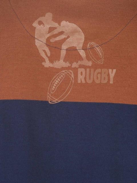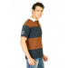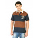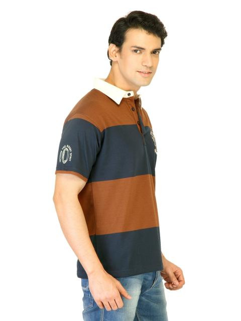 Brown and blue striped polo T-shirt made of 100% cotton, has short sleeves, contrast collar, buttoned chest placket, embroidered club logo on left chest, club print on the left sleeve and a vented hem