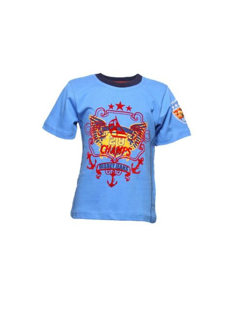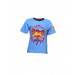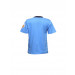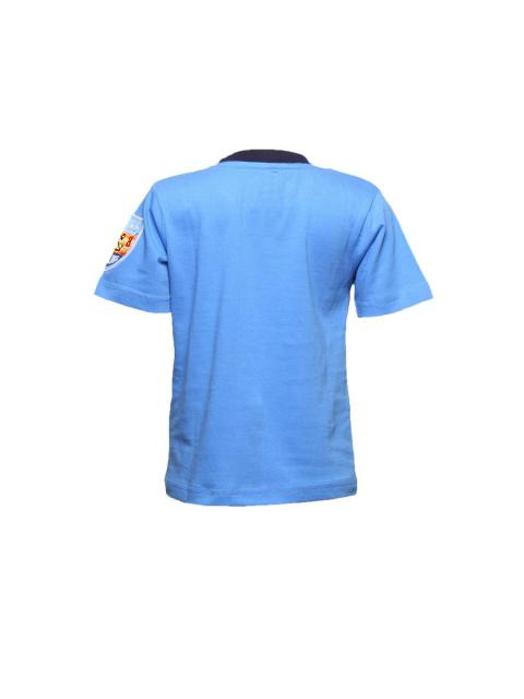 Blue crew neck t-shirt made of 100% cotton, with navy blue ribbing, contrast red band on the inseam of the neckline, graphic on the front and printed seal on the sleeve