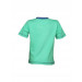 Mint green t-shirt in 100% cotton with contrast blue neckline and blue stitch detailing along sleeve and shirt hem
