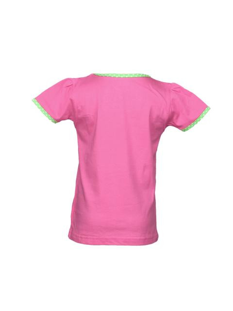 Fuchsia pink top with green and white polka dot piping along the neckline and sleeves and big bow below the collar in similar polka dots, mildly puffed sleeves and Minnie Mouse print on chest