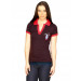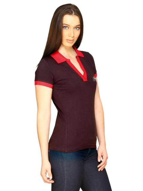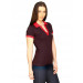 Wine red polo neck t-shirt made of 50% bamboo and 50% cotton, with a red collar, sleeve hems and open V-neck placket and applique with print on left chest