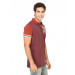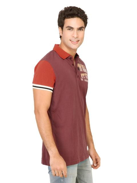 Brown polo T-shirt made of 100% cotton, has fabric tape detailing on the inseam of the neckline, red short sleeves with beige and black ribbing and pleated at the hems, a half buttoned placket, brand name embroidered on the chest and the back, and tattoo art printed on the back
