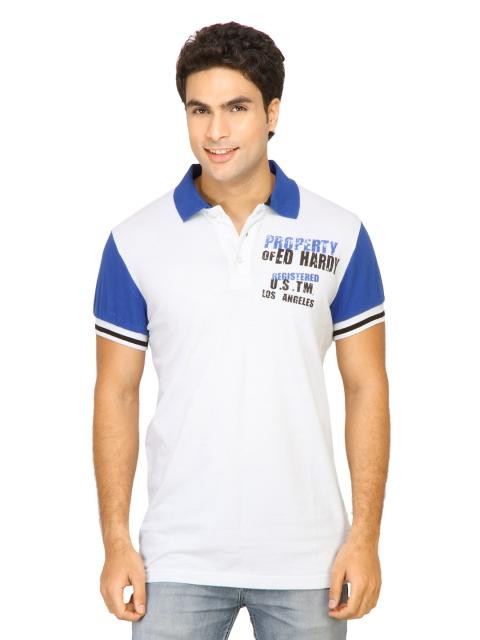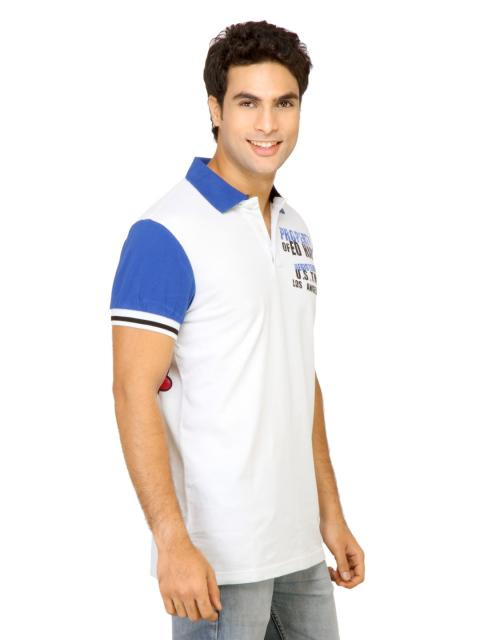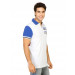 White polo T-shirt made of 100% cotton, has fabric tape detailing on the inseam of the neckline, blue short sleeves with white and black ribbing and pleated at the hems, a half buttoned placket, brand name embroidered on the chest and the back, and tattoo art printed on the back