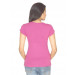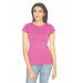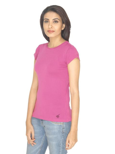 Fuschia pink top, has a round ribbed neck, short sleeves and embroidered branding above the left hem