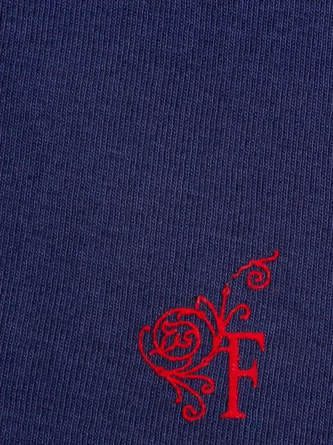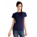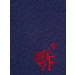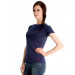 Navy blue top, has a round ribbed neck, short sleeves and embroidered branding above the left hem