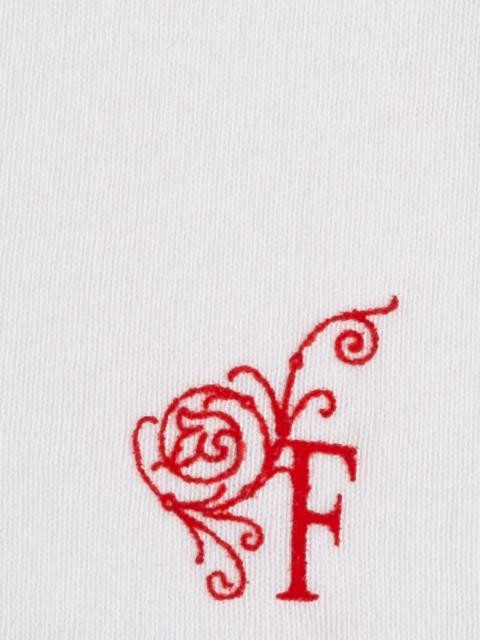 White top, has a round ribbed neck, short sleeves and embroidered branding above the left hem