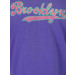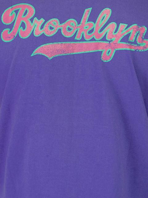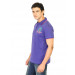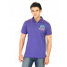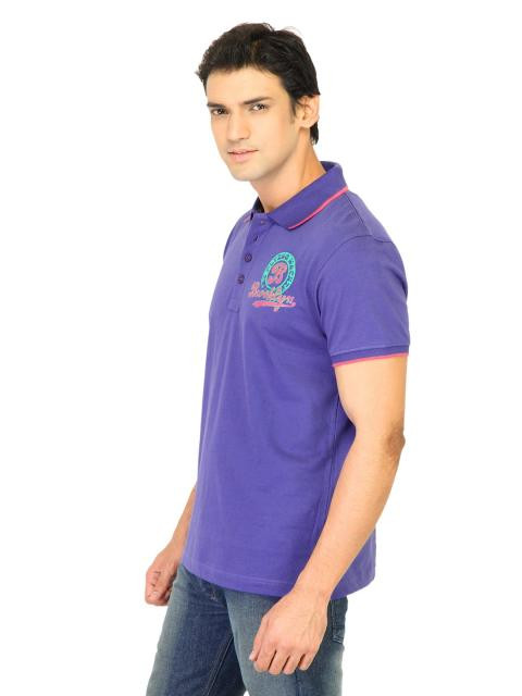 Blue polo neck T-shirt made of 100% cotton, has short sleeves with ribbed hems, pink tipping on the collar and sleeve hems, and distressed graphic print on the left chest and back