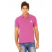 Fuschia pink pique polo neck t-shirt made of 100% cotton, that has a ribbed collar and sleeve hems with yellow and blue tipping, tape detailing on the inseam of the collar, buttoned chest placket, embroidered brand name on the left chest, appliqued brand tab on the left hem and vented hems