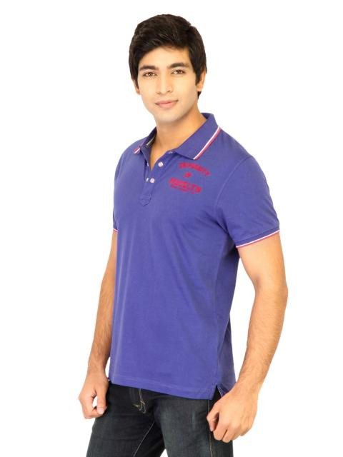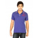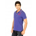 Blue polo neck T-shirt made of 100% cotton, has red and white tipping on the collar and cuffs, short sleeves, flock print on the left chest and a vented hem