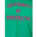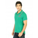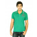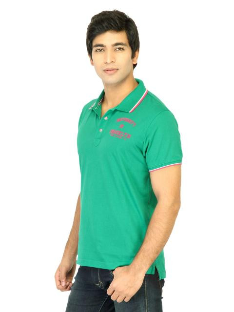 Green polo neck T-shirt made of 100% cotton, has short sleeves with ribbed hems, pink and white tipping on the collar and sleeve hems, and flock print on the left chest and back