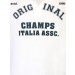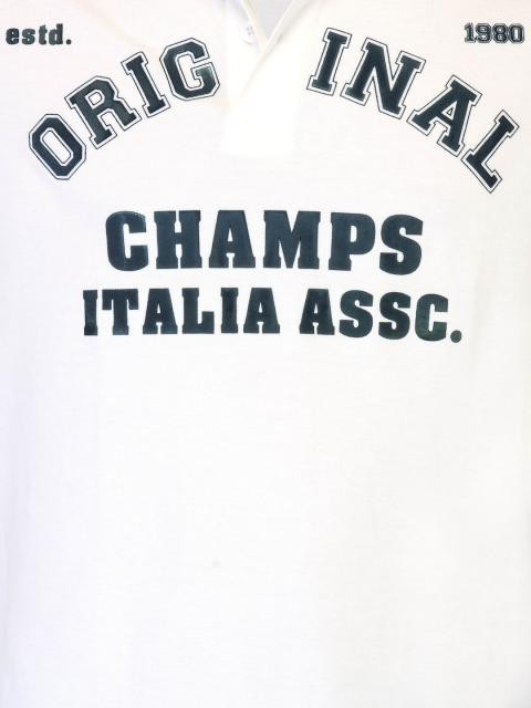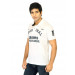 White polo T-shirt made of 100% cotton, has short sleeves with ribbed hems, ribbed collar with a buttoned chest placket, graphic print on the front and sleeves, and a vented hem