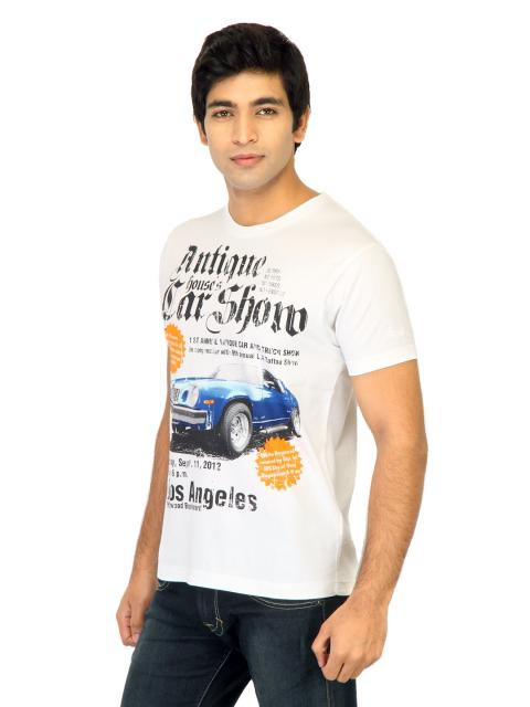 Up your style statement with ease by slipping into this T-shirt from flying machine. The soft cotton fabric offers exemplary comfort all day, while the brand embroidery on the left sleeve adds a stylish edge. Team it with jeans and sports shoes for a casual look.