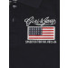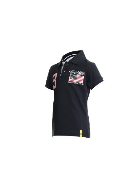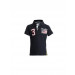 Navy blue polo neck T-shirt, made of 100% cotton, has short sleeves with ribbed cuffs, chest placket, brand name embroidered on the left chest and brand tag on the hem
