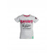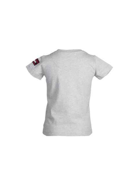 Light grey round neck T-shirt, has graphic print on the front, branding appliquéd on the left sleeve and brand tag on the hem